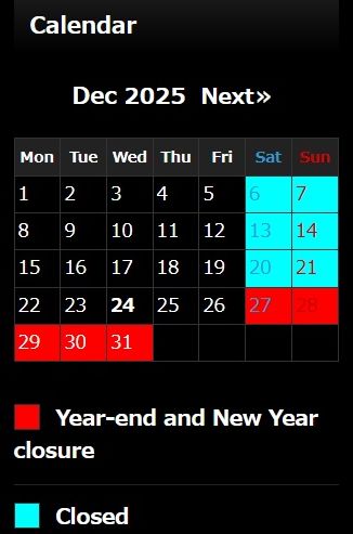 Orders will still be accepted during this time, but shipping operations will resume on January 5 (Mon), 2026.