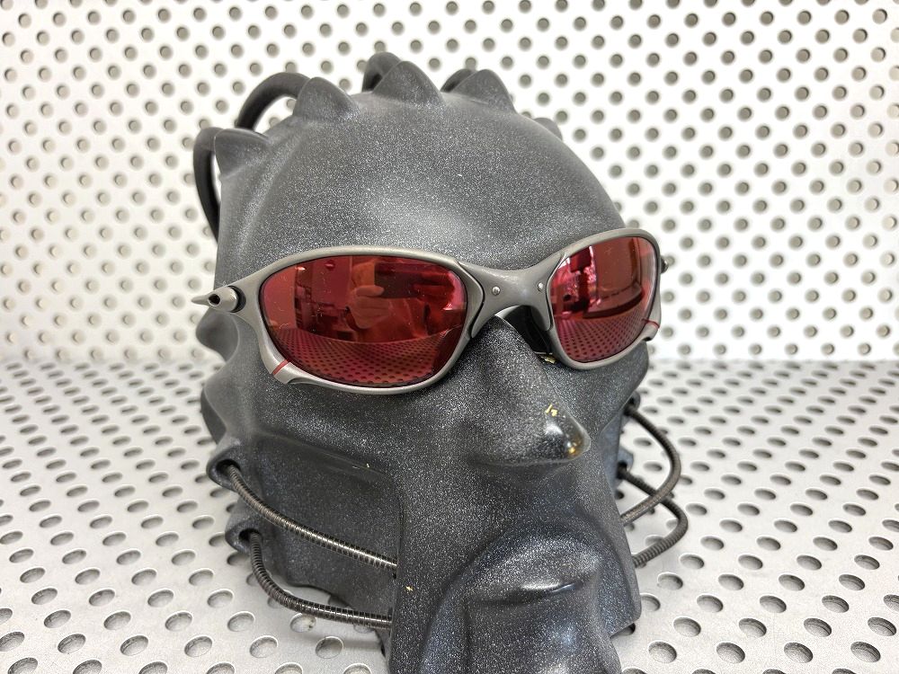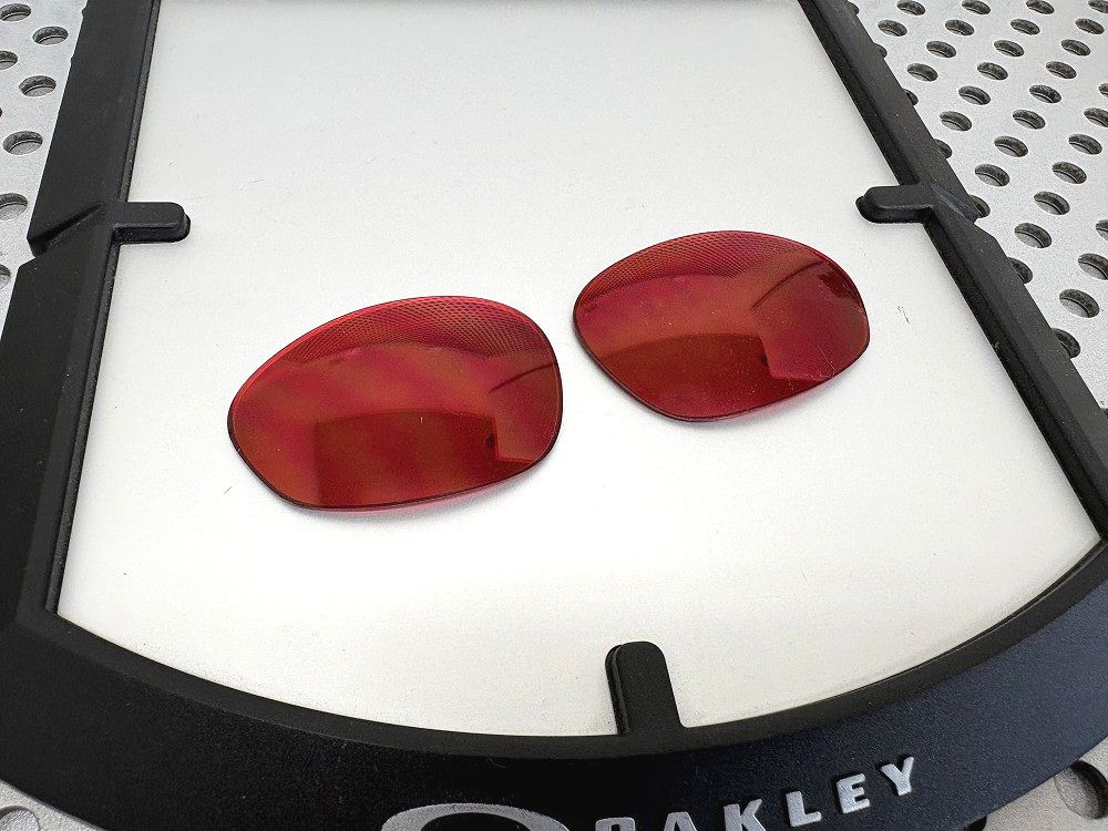 The lens features a vibrant red base with a silver mirror coating on the back. Thanks to the mirror, others can't see the wearer's eyes in most conditions, providing a unique red perspective of the surroundings when looking through the lens.
